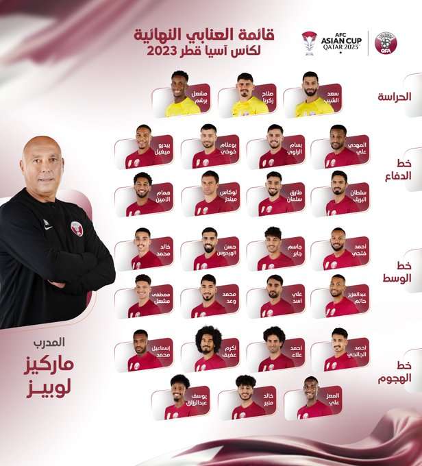 استقر ماركيز لوبيز على القائمة النهائية لمنتخب قطر، الذي يستعد للدفاع عن لقب بطل كأس آسيا لكرة القدم 2023، التي جاءت كالتالي: