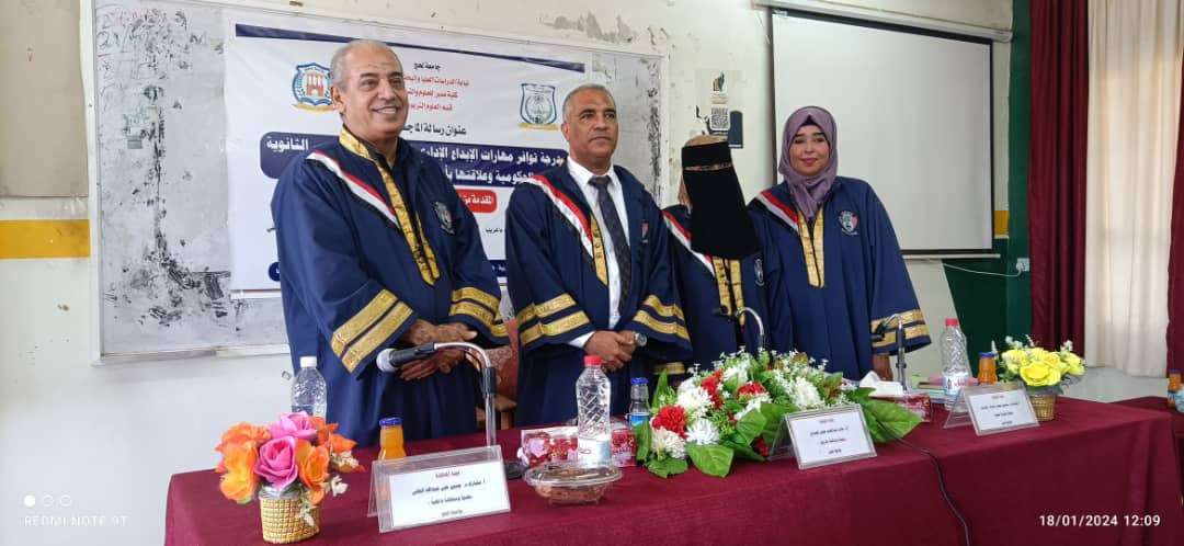 بعنوان " درجة توافر مهارات الابداع الإداري لدى مديري المدارس الثانوية الحكومية وعلاقتها بأداء مهامهم في العاصمة عدن".