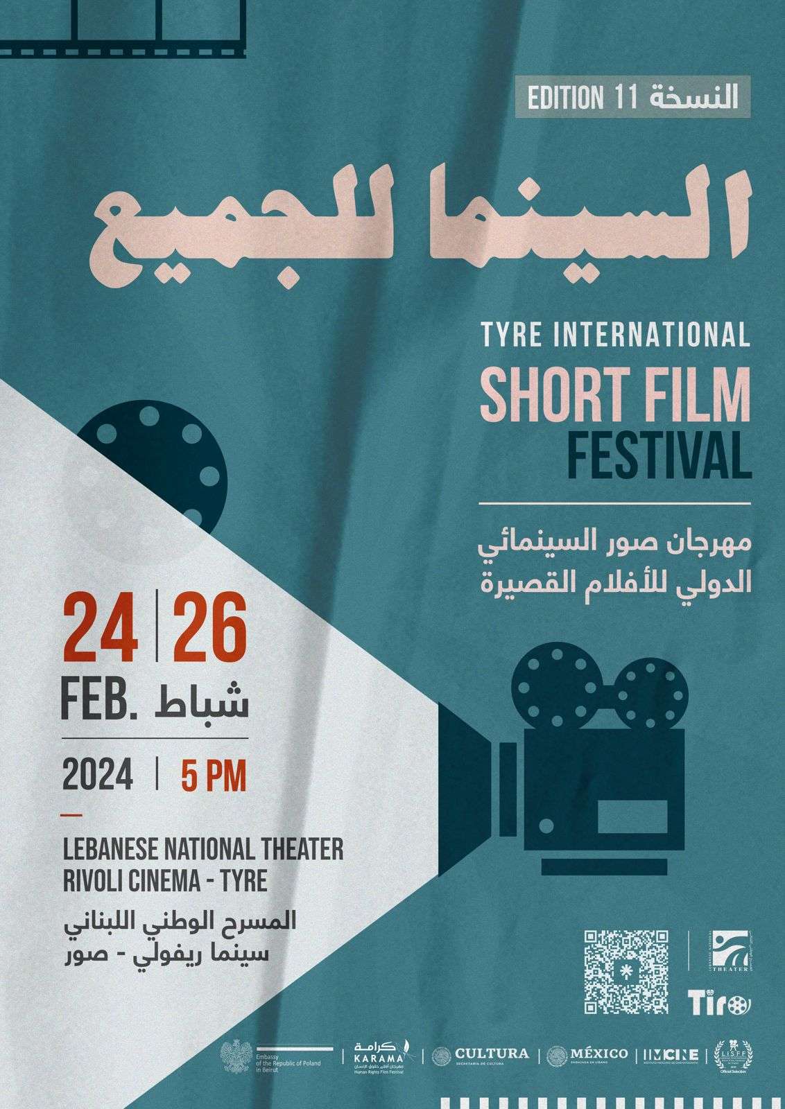 أعلنت "جمعية تيرو للفنون"، و"مسرح إسطنبولي" عن انطلاق فعاليات "مهرجان صور السينمائي الدولي للأفلام القصيرة" بنسخته الحادية عشر في الفترة من 24 ولغاية 26 شباط / فبراير في "المسرح الوطنيّ اللّبنانيّ المجاني" في مدينة صور، تحت شعار “السينما تقاوم“ وبمشاركة 29 فيلمًا تتنوع بين الروائي والوثائقي والتحريك، من 27 دولة، هي السعودية، والعراق، وفرنسا، وإيران، وسورية، والبحرين، وسويسرا، والولايات المتحدة الأميركية، والمملكة المتحدة، وبلجيكا، وفلسطين، وإيطاليا، ومصر،والمكسيك ،وبولندا، وفنلندا ،والامارات، والمغرب، وسلطنة عمان وزامبيا ،والنرويج، وأيسلندا ،وإسبانيا ،والارجنتين، وجمهورية التشيك، وكندا، ولبنان، وذلك بالتعاون مع مؤسسة دروسوس السويسرية. وتتنافس الأفلام المشاركة ضمن المسابقة الرسمية للمهرجان على جوائز أفضل فيلم روائيّ، وأفضل فيلم وثائقيّ، وأفضل فيلم تحريك، وأفضل ممثّل، وأفضل ممثّلة، وأفضل تصوير، إضافة إلى جائزة لجنة التحكيم. وتضم لجنة التحكيم كلًا من المخرجة الإسبانية أنا سندريرو ألفريز، والممثل عمر ميقاتي، والمخرج صلاح عطوي من لبنان.