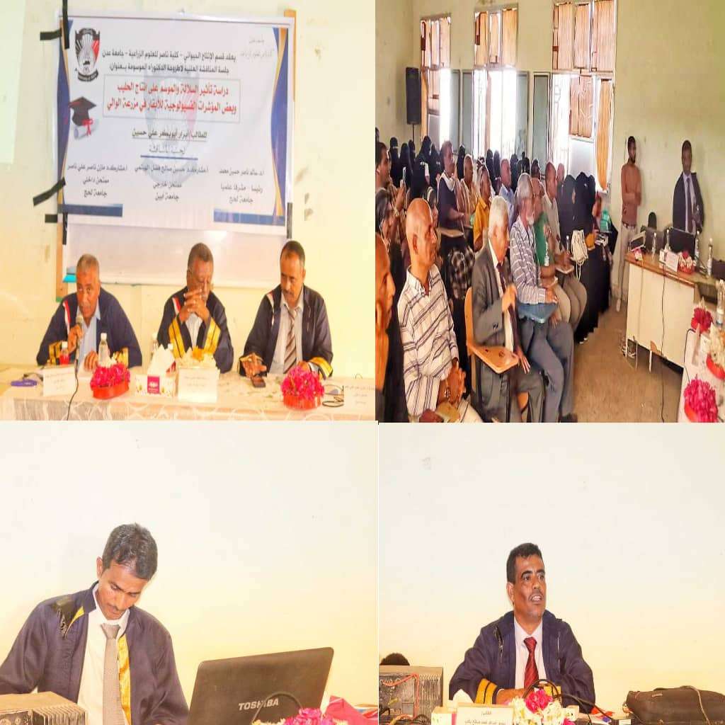 ولقد تكونت لجنة المناقشة حول رسالة الدكتوراة للطالب " ابرار ابوبكر " من أ.د. سالم ناصر حسين محمد ..رئيس مشرفا علميا من جامعة لحج وأ. مشارك د. حسين صالح الهيثمي.. ممتحن خارجي من جامعة أبين وأ. مشارك د. مازن ناصر الكازمي عميد كلية ناصر ممتحن داخلي جامعة لحج ، حيث ناقشت الطالب حول أطروحته ودراسته الميدانية التي قام بها في مزرعة الوالي وشملت الدراسة 126 سجلا لعدد من الأبقار وتم استخلاص ثلاث تجارب حول الصفات الإنتاجية لابقار الفريزيان والتباينات المعنوية على الصفات الفسيولوجية وتأثير تسلسل الولادة .