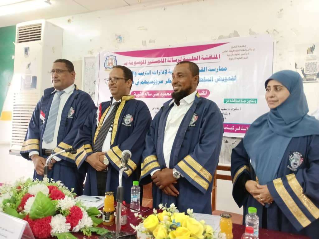 نال الطالب" محمود علي سالم الشيبه " شهادة الماجستير " بأمتياز" من جامعة عدن - كلية التربية" على رسالته الموسومة بــ "ممارسات القيادات التربوية لإدارات التربية والتعليم لتفويض السلطة من وجهة نظر مرؤوسيهم في محافظة لحج ".