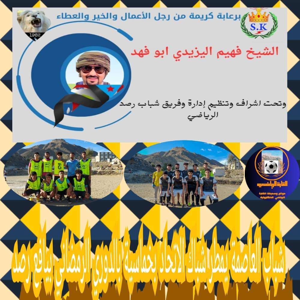 اقيمت عصر هذا اليوم الجمعة الموافق 22 مارس 2024م المباراة رقم (8) في إطار المجموعة الثانية بالدوري الكروي الرمضاني للفرق الشعبية بمديرية يافع رصد محافظة أبين، والتي جمعت بين فريقي شباب العاصمة (شباب رصد) واتحاد (شريان) وبرعاية كريمة من رجل الأعمال والخير والعطاء الشيخ فهيم اليزيدي ابو فهد وتنظيم إدارة وفريق شباب رصد الرياضي وعلى ملعب ساجور الترابي بالعاصمة رصد، بقيادة طاقم تحكيمي مكون من حكم الساحة الكابتن محمود سالم لحوري وحكام الراية حسين عبدالله وعنتر عدنان وحكم رابع ملهم العفيفي.