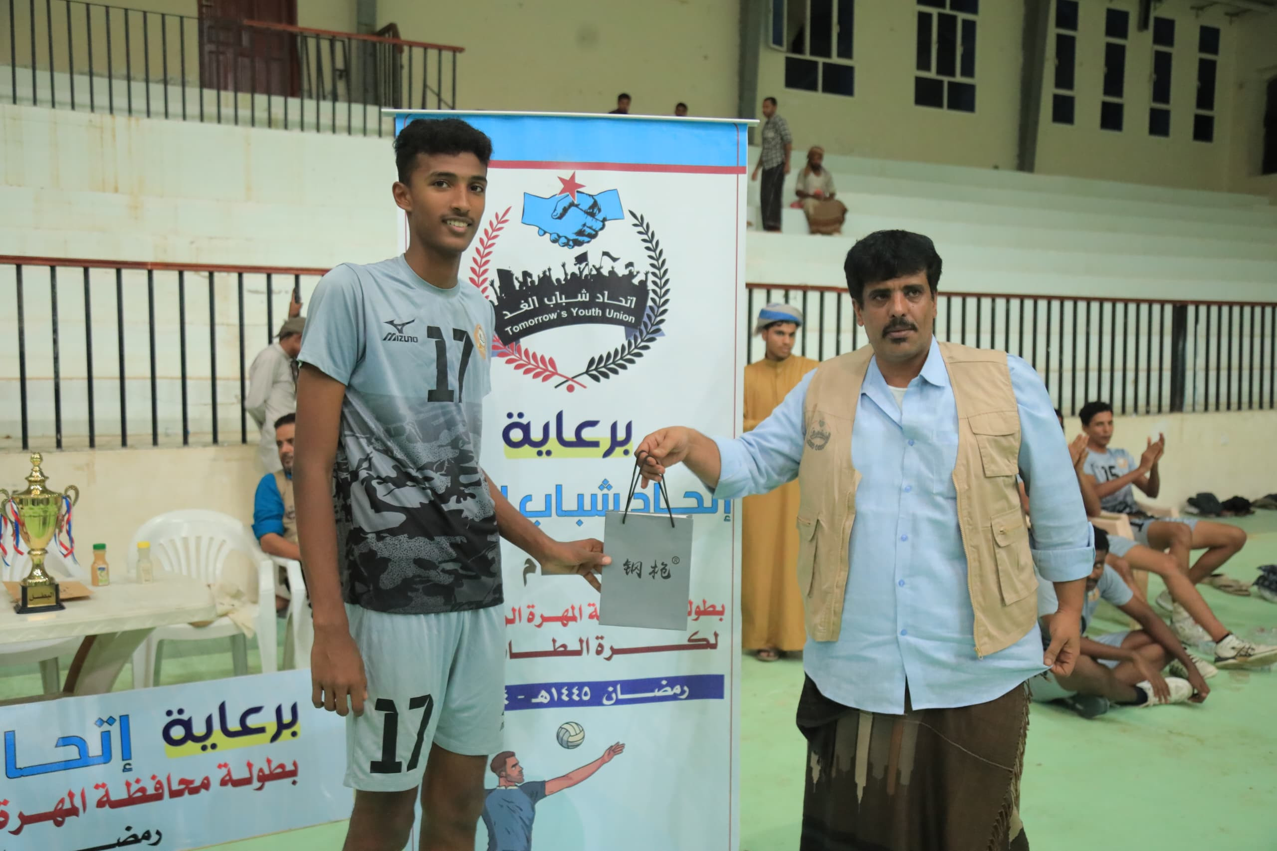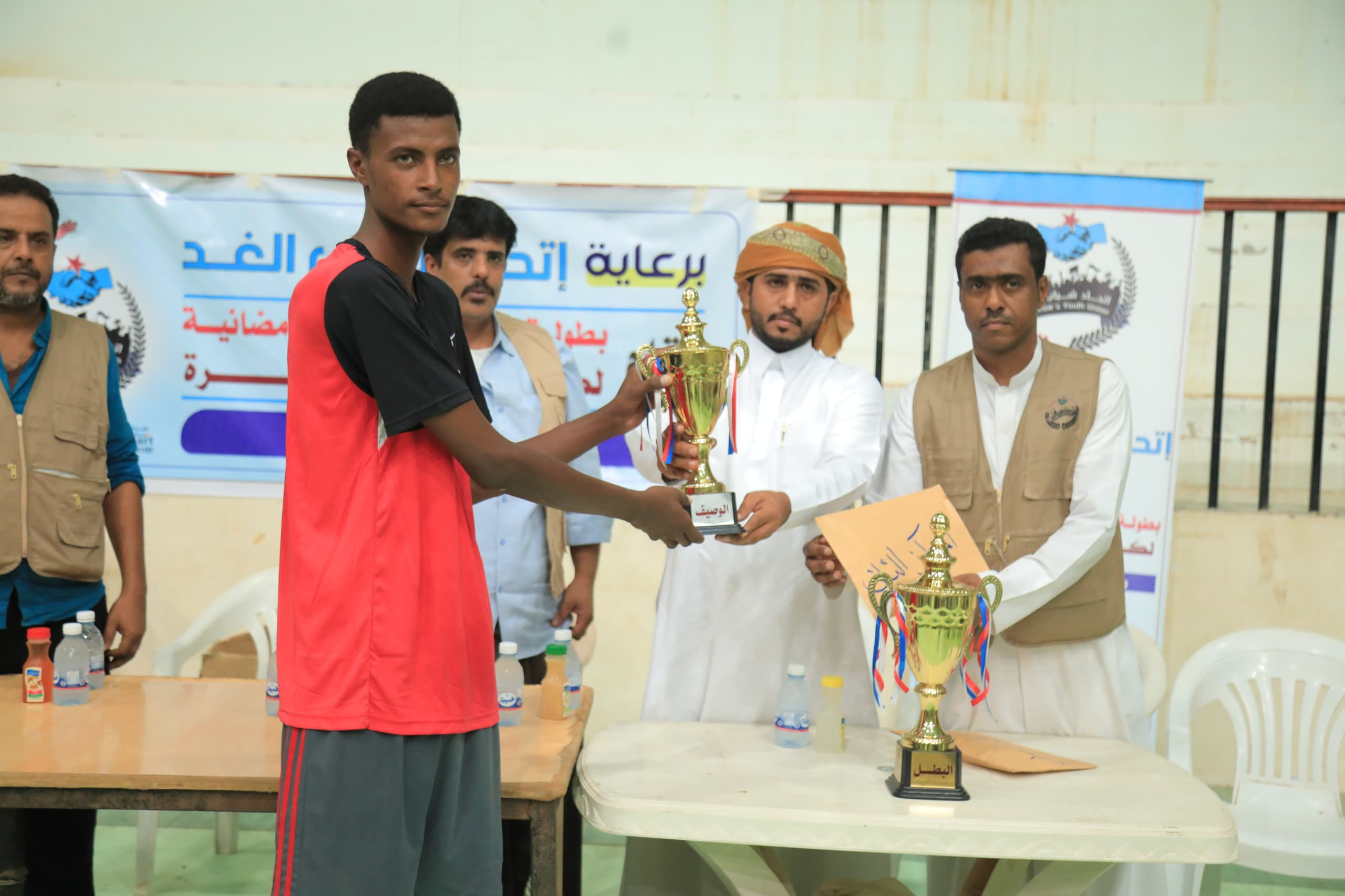 كرم رئيس اتحاد الغد الشيخ جميل السنح بلحاف، مساء امس فريق العروبة نادي خيبل بمديرية الغيضة، بعد تتويجه بطلاً في تجمع الغيضة وتأهله إلى التصفيات النهائية على مستوى محافظة المهرة في بطولة كرة الطائرة التي ينظمها الإتحاد.
