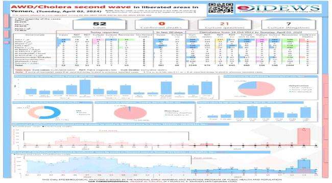 وأوضح من خلال مرفق بياني تقرير تفصيلي رسمي ليوم 2 أبريل 2024 عن حالات الكوليرا مشددا على النظافة والابتعاد عن الأماكن الملوثة واغلاق منافذ الاشتباه بالمرض والذي سيحد من حالات الانتشار .