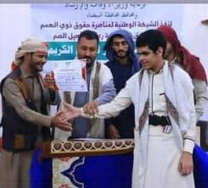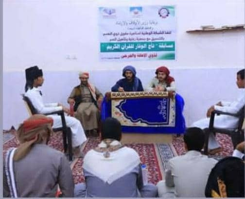 برعاية كريمة من وزير الأوقاف والإرشاد ومحافظ محافظة البيضاء .. نفذت الشبكة الوطنية لمناصرة ذوي الهمم وجمعية رعاية وتأهيل الصم البيضاء محافظة البيضاء لأول مرة مسابقة " تاج الوقار للقرآن الكريم " لذوي الإعاقة والجرحى