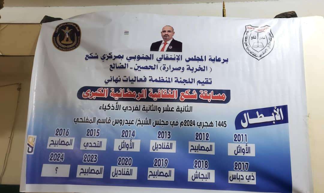 وشهدت المسابقة حضور الشخصية الاجتماعية مدير مديرية قعطبة بكر مانع الشاعري ومدير مكتب التربية والتعليم في المحافظة عبد القوي المليجي ورئيس إدارة الشباب والرياضة في تنفيذية الإنتقالي بمديرية الحصين عبد الناصر باعباد ورئيسي الإنتقالي بمركزي شكع (الخربة وصرارة ) العقيد عبد السلام محمد والأستاذ محمد قايد ونائب رئيس انتقالي مركز الخربة الأستاذ سنان صالح وقامت اللجنة بتكريمهم بشهائد شكر وتقدير لاسهامهم في انجاح الأنشطة الثقافية في شكع.
