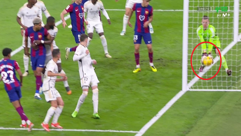 ففي الدقيقة 28، نفذ جناح برشلونة رافينيا ركلة ركنية على القائم القريب، قابلها لامين جمال بلمسة واحدة خادعة، وأبعدها حارس ريال مدريد أندريه لونين بصعوبة، فيما بدا أن الكرة عبرت خط المرمى.