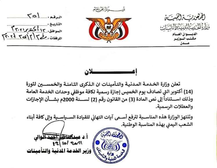 الخدمة المدنية تعلن الخميس إجازة رسمية بمناسبة ذكرى ثورة 14 أكتوبر