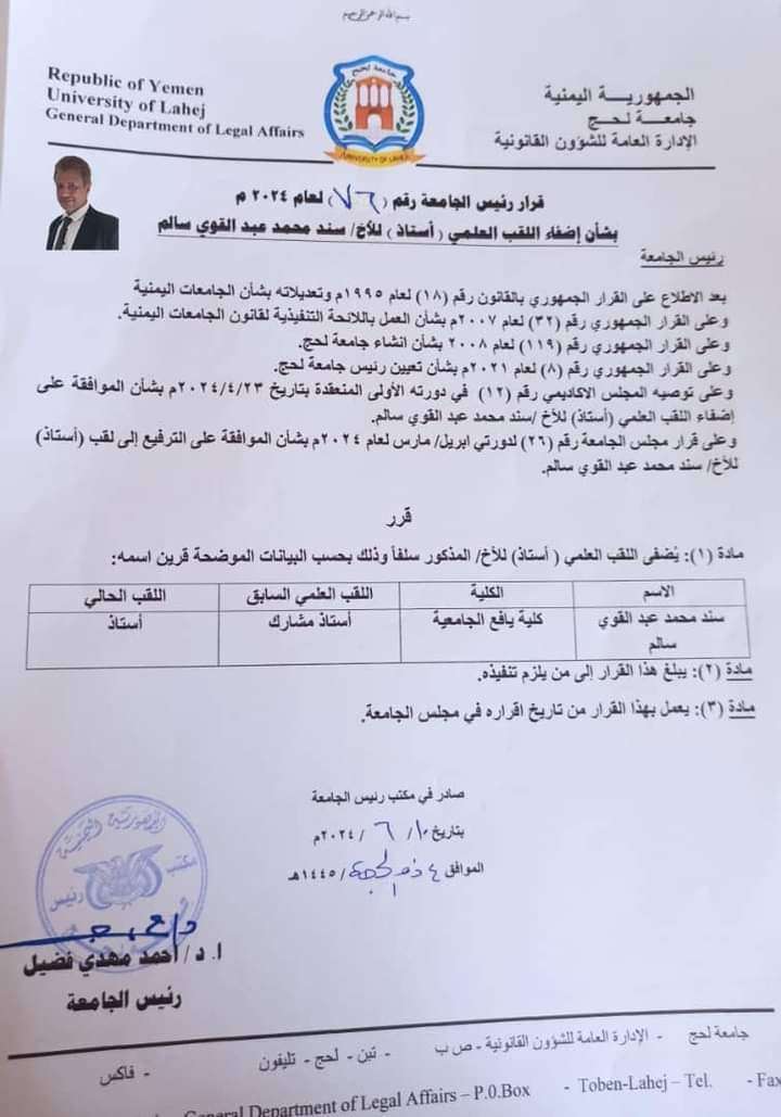 جامعة لحج تمنح لقب الأستاذية للدكتور سند محمد عبدالقوي