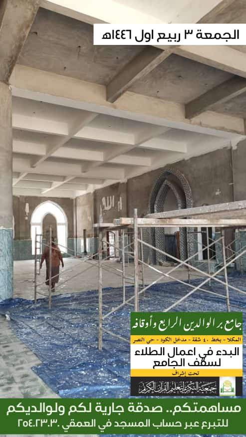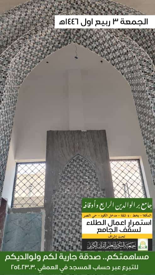 وتستمر مسيرة البر في هذا المشروع -بفضل الله- منذ أن اطلقنا فرصة المساهمة للجميع في مسجد جامع بر الوالدين الأول بفوه المساكن - المعهد التجاري ثم الثاني بغيل باوزير ثم الثالث بجول مسحه - المعهد الصناعي المهني والعمل مازال مستمر بجامع بر الوالدين الرابع واوقافه بخط 40 شقة مدخل الكود حي النصر.