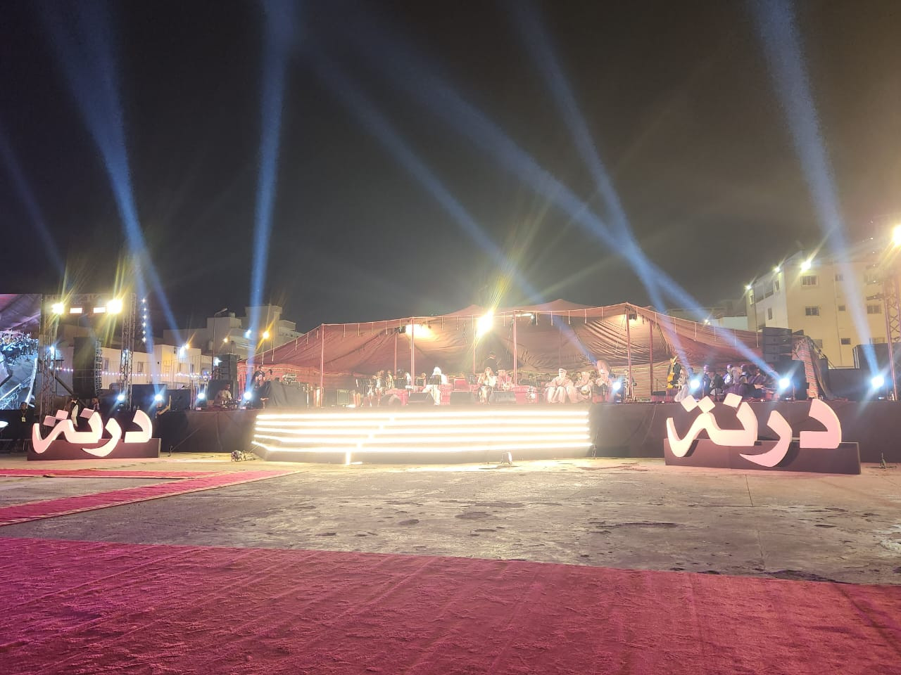 تحت خيمة نُصبت في الهواء الطلق وسط مدينة درنة التي عاشت قبل سنة مأساة طبيعية أودت بحياة الآلاف انتظم حفل فني مساء الأربعاء 16 أكتوبر 2024 أحياء الفنان الليبي خالد الزروق والفنانة المصرية غادة رجب.