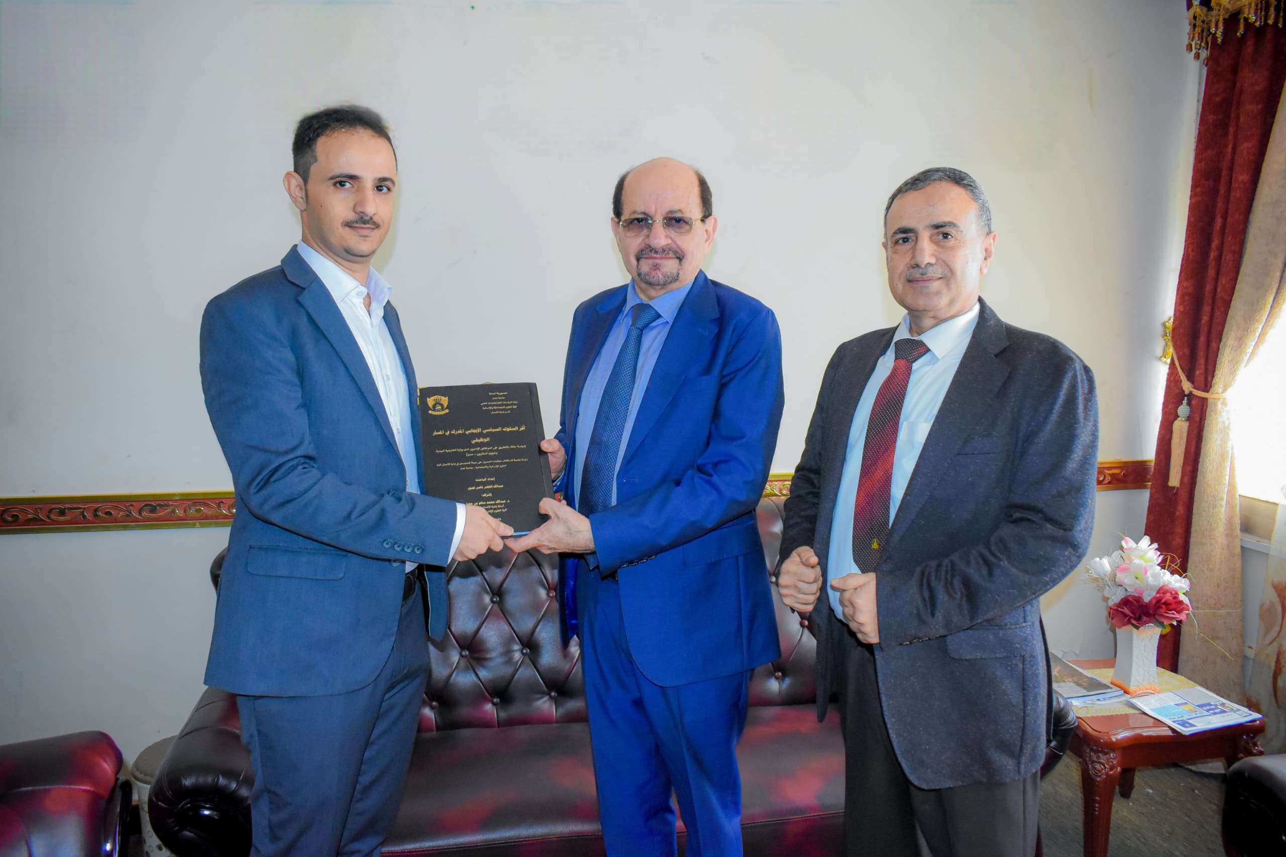 جاء ذلك لدى تسلمه اليوم الأحد 20 أكتوبر 2024م نسخة من رسالة الماجستير للباحث/عبدالله الخضر ناصر لصور، والتي حملت عنوان (أثر السلوك السياسي الإيجابي المدرك في المسار الوظيفي: دراسة حالة بالتطبيق على الموظفين الإداريين لدى وزارة الخارجية اليمنية وشؤون المغتربين ـ عدن) والحاصل عليها من كلية العلوم الاجتماعية والإنسانية بجامعة عدن، حيث أهدى عبدالله لصور نسخة من الرسالة التي كانت عبارة عن تطبيق عملي أجراه الباحث على الموظفين الإداريين في وزارة الخارجية وشؤون المغتربين في العاصمة عدن.
