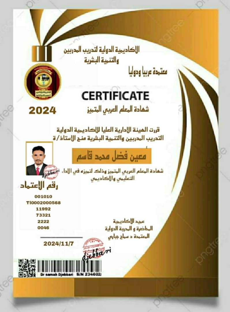 منحت الأكاديمية الدولية لتدريب المدربين والتنمية البشرية شهادة "المعلم العربي المتميز" للأستاذ معين فضل محمد قاسم، وذلك تقديراً لجهوده البارزة في تطوير التعليم وتعزيز قدرات الطلاب، ولنجاحه في اجتياز جميع اختبارات الأكاديمية التي تعتمد على معايير عالية في تقييم الأداء والتميز.
