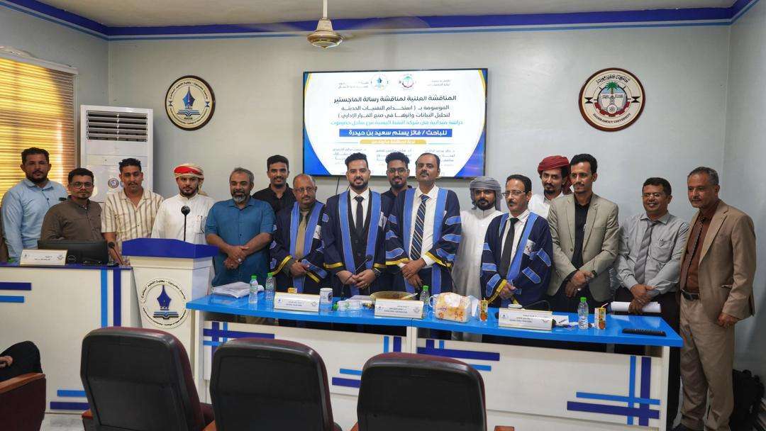 عقدت بقاعة المناقشات الجلسة العلنية لمناقشة رسالة الماجستير للباحث فائز يسلم بن حيدرة في تخصص ادارة الأعمال بكلية التعليم المفتوح بجامعة حضرموت ، عن رسالته الموسومة بـ(باستخدام التقنيات الحديثة لتحليل البيانات وأثرها في صنع القرار الإداري بشركة النفط اليمنية ساحل حضرموت ) .
