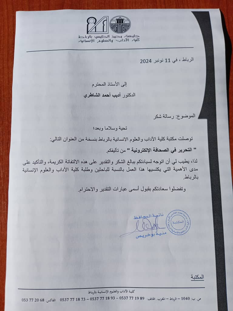 بعثت كلية الآداب والعلوم الإنسانية بجامعة محمد الخامس بمدينة الرباط المغربية برسالة شكر إلى الدكتور أديب الشاطري، على كتابه التحرير الصحفي في الصحافة الإلكترونية..
