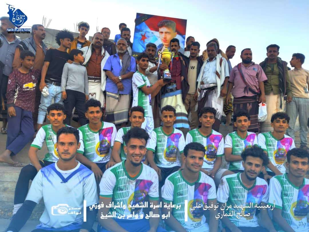 أحرز فريق شهداء القطاع كأس أربعينية الشهيد مران توفيق أثر فوزهم على فريق العضبة بأربعة أهداف مقابل هدف في اللقاء الذي جمع بين الفريقين عصر يوم السبت الموافق 7 ديسمبر 2024م في مدينة الحبيلين بلحج.