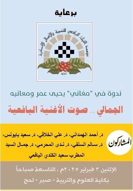 تستعد مؤسسة التراث اليافعي لإقامة ندوة شعرية مميزة تحمل عنوان "يحيى عمر سافع الغرام المشألي"، وذلك في 3 فبراير 2025م. سيجمع الحدث نخبة من الشعراء والنقاد والمحبين للثقافة والأدب.