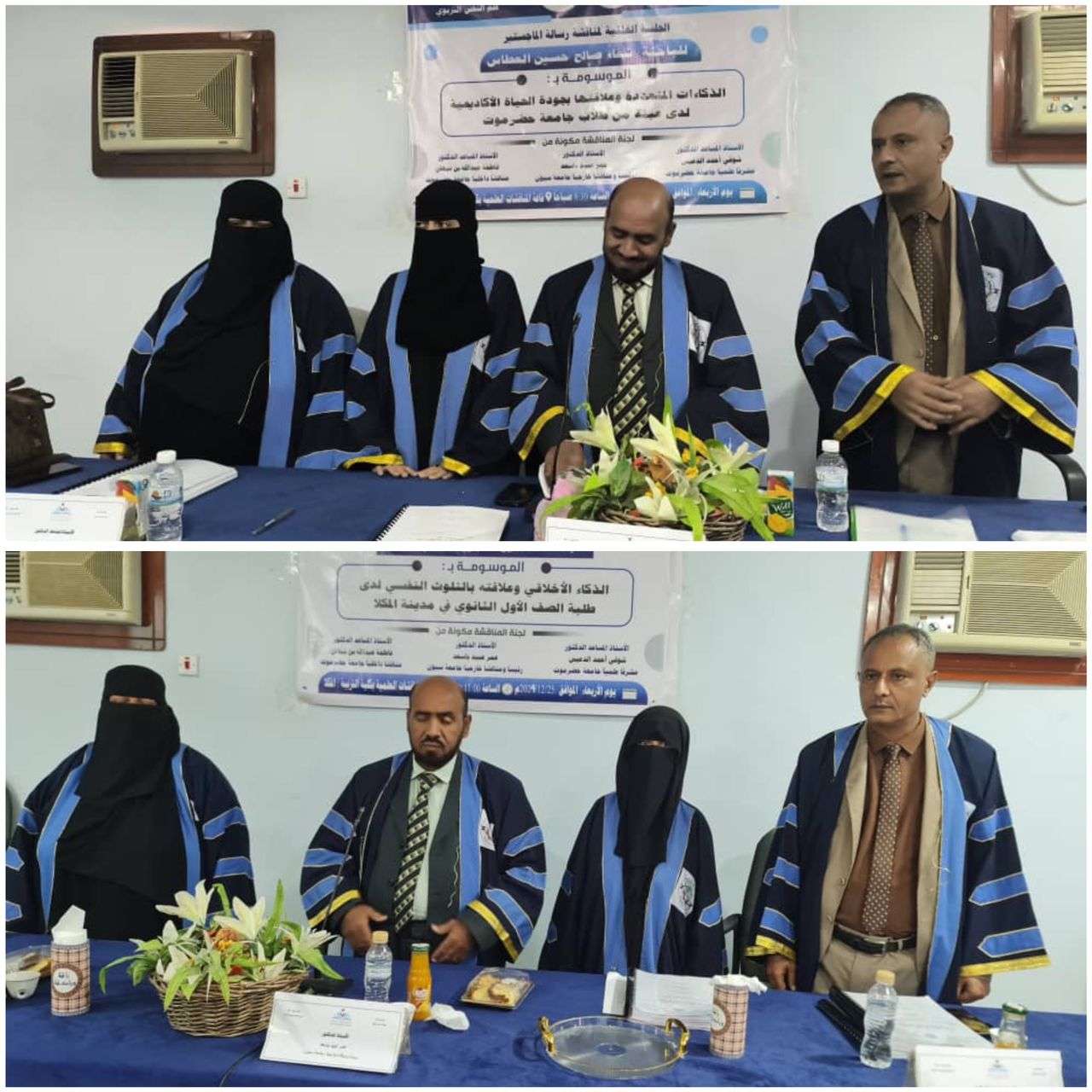 وناقشت الباحثة شفاء صالح حسين العطاس رسالتها الموسومة بـ“الذكاءات المتعددة وعلاقتها بجودة الحياة الأكاديمية لدى عينة من طلاب جامعة حضرموت”، وهدفت الدراسة إلى دراسة تأثير الذكاءات المتعددة على جودة الحياة الأكاديمية، مع تسليط الضوء على دورها في تحسين الأداء التعليمي للطلاب.