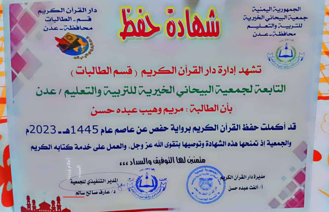 نتقدم بأحر التهاني والتبريكات للشابة مريم وهيب بمناسبة إنجازها العظيم بحفظ كتاب الله "القرآن الكريم"، وتكريمها من قبل دار القرآن الكريم مع مجموعة من الحافظات المتميزات.