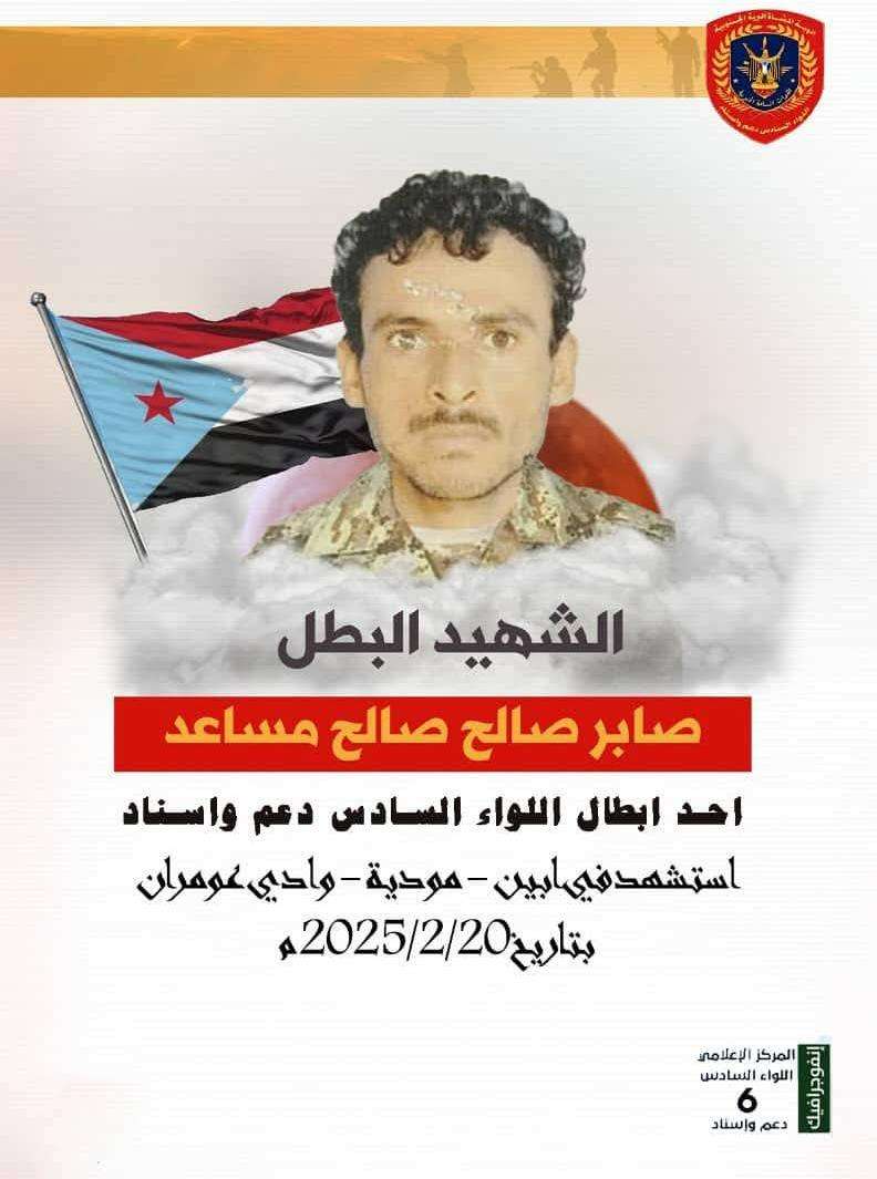 نعى العميد الركن علي ناصر المعكر، قائد اللواء السادس دعم وإسناد، استشهاد البطل صابر صالح صالح مساعد، أحد أبطال اللواء، الذي ارتقى شهيدًا إثر عملية إرهابية غادرة في وادي عومران بمديرية مودية، محافظة أبين.
