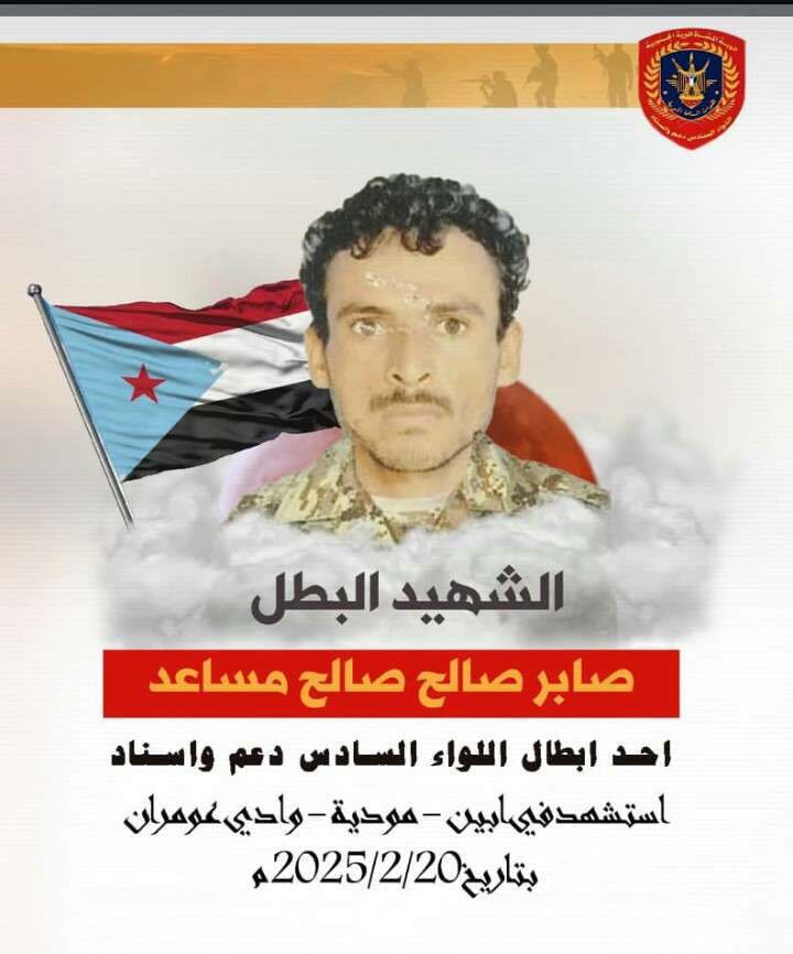 بعث قائد الكتيبة الثالثة في اللواء السادس دعم واسناد النقيب /فواز محمد (الحجري) ابو نواف، برقية عزاء ومواساه الى اسرة الشهيد / صابرصالح صالح مساعد الحريبي ،الذي استشهد يوم الخميس، برصاصة قناصة ارهابي ،بموقع الشرف والبطوله ،في وادي عومران مديرية مودية محافظة ابين .