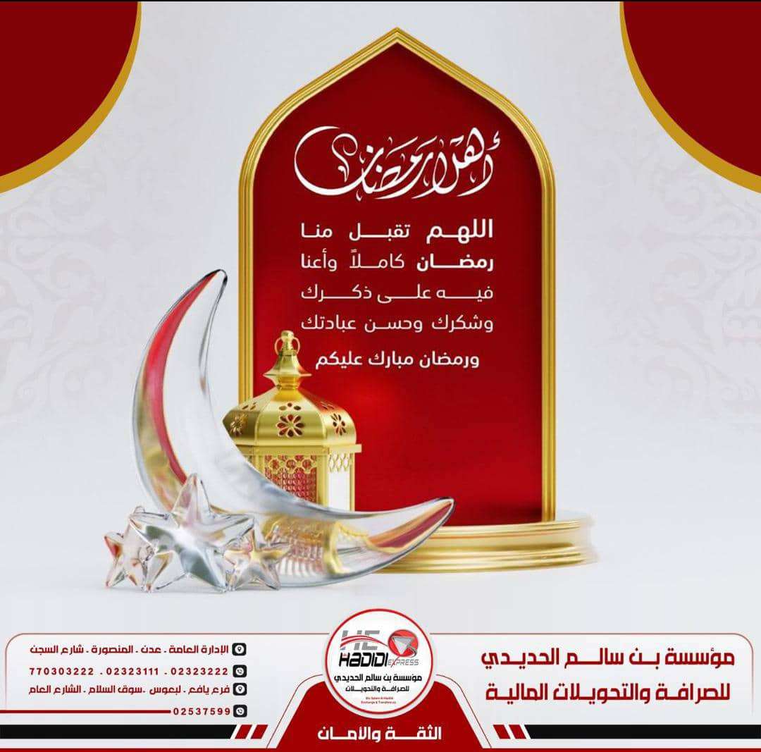 مؤسسة بن سالم الحديدي للصرافة تهنئ عملاءها والأمة الإسلامية بحلول شهر رمضان