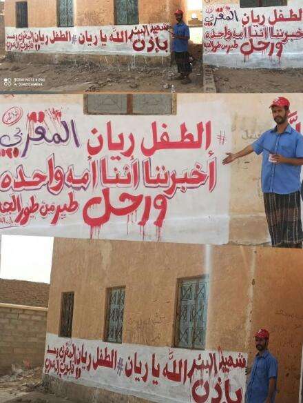 وعبّر أحد أبناء شبوة عن تضامنه مع الطفل ريان بأعمال الرسم والكتابة الخطية التي تعبر عن الوحدة العربية والتفاعلات عبر وسائل الإعلام والتواصل الاجتماعي التي رسمها الشهيد ريان.