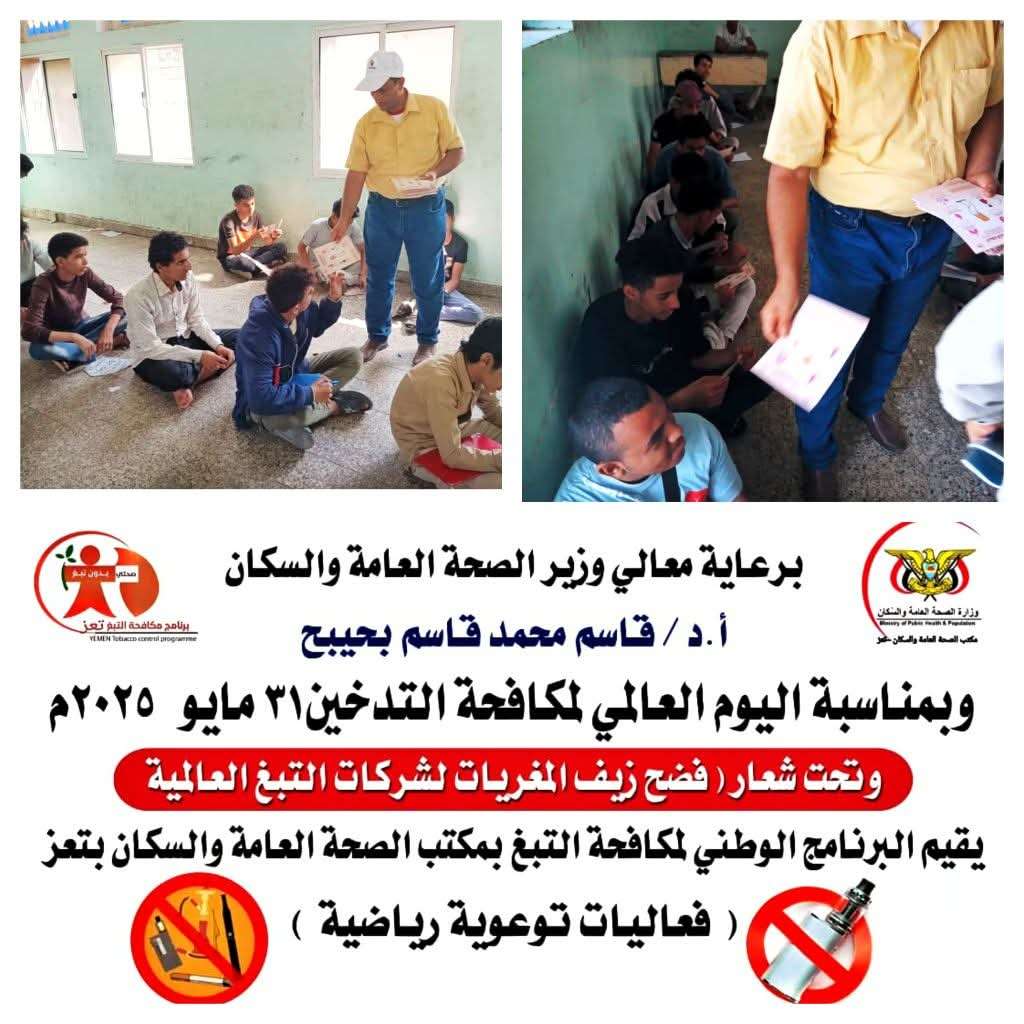 برعاية معالي وزير الصحة العامة والسكان وتحت شعار: "كشف زيف المغريات لشركات التبغ العالمية" أطلق البرنامج الوطني لمكافحة التبغ في محافظة تعز حملة توعوية شاملة تستهدف طلاب المدارس وفئة الشباب، بهدف التوعية بمخاطر منتجات التبغ الحديثة وكشف الحيل التسويقية التي تنتهجها شركات التبغ العالمية·