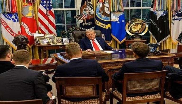 وخلال لقاء لاحق مع الرئيس الأوكراني فولوديمير زيلينسكي، جلس ترامب على الأرائك المخصصة عادة لمثل هذه الاجتماعات.