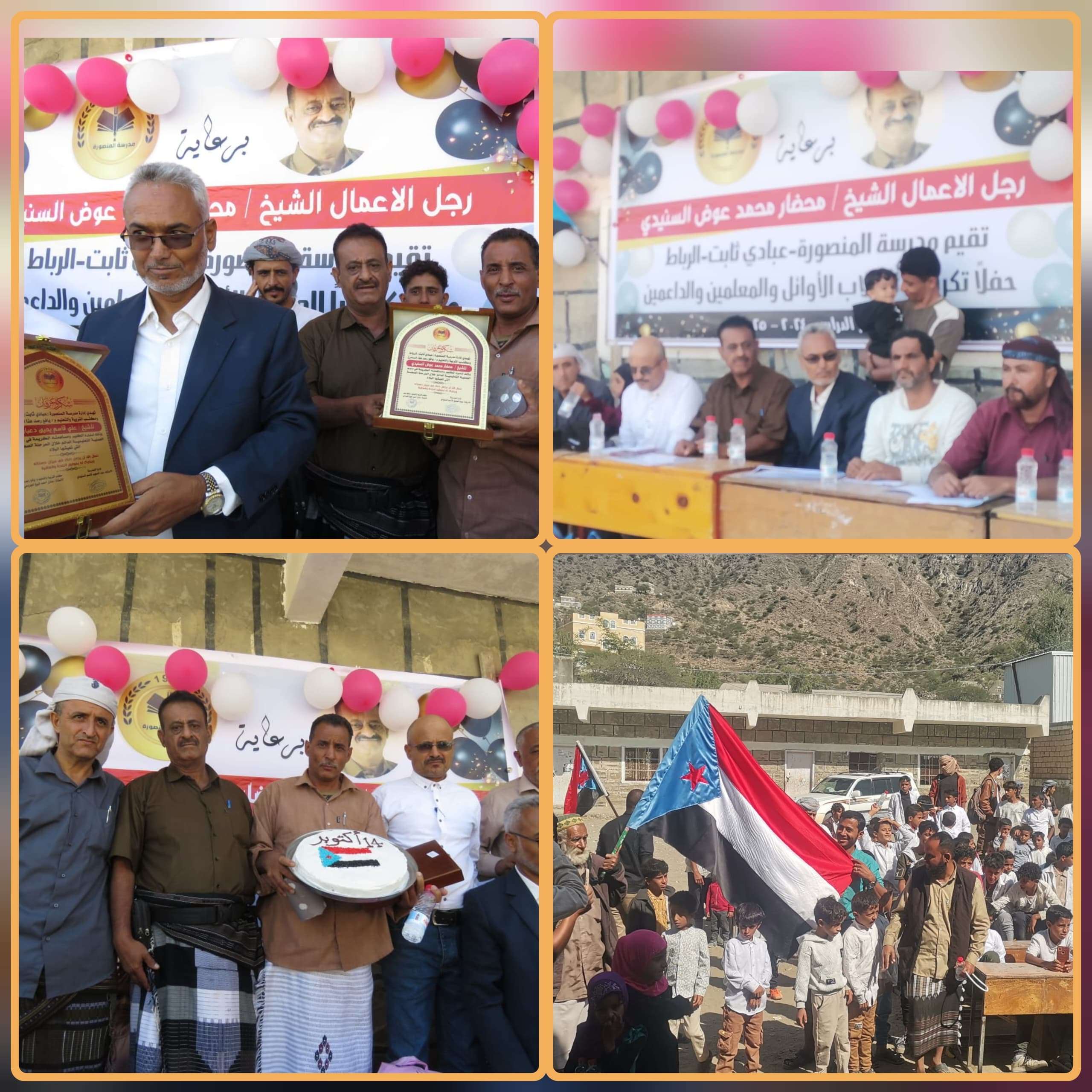 برعاية رجل الأعمال الشيخ محضار محمد عوض السنيدي، وفي أجواء احتفالية مميزة، شهدت مدرسة الشهيد عبادي ثابت منصر "المنصورة" للتعليم الأساسي وثانوية الرباط بمديرية يافع رُصد محافظة أبين، صباح اليوم الثلاثاء، فعالية احتفالية جمعت بين تكريم الطلاب المتفوقين دراسياً والاحتفاء بالذكرى الثانية والستين لثورة الرابع عشر من أكتوبر المجيدة التي انطلقت شرارتها الأولى من قمم جبال ردفان الشمّاء ضد الاستعمار البريطاني عام 1963م، تلك الثورة التي تكللت – بفضل تضحيات الأبطال – بالنجاح وطرد آخر جندي بريطاني في 30 نوفمبر 1967م.