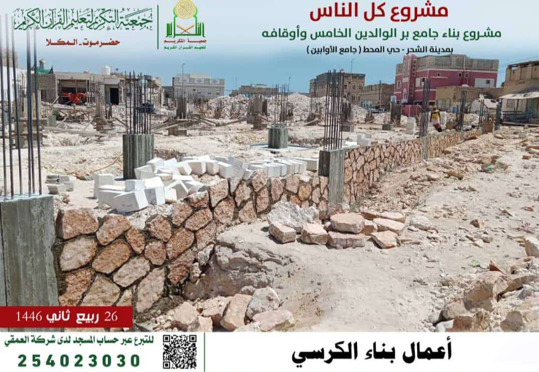 تعمل جمعية التكريم لتعليم القرآن الكريم في الاستمرار بأعمال بناء الكرسي والصبيات وعزل القواعد بمشروع جامع برّ الوالدين الخامس وأوقافه بحي المحط بمدينة الشحر تحت شعار "مشروع كل الناس".